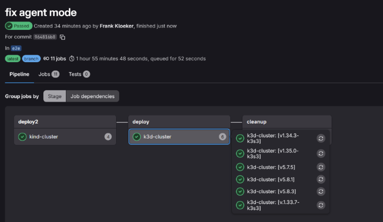 Ende zu Ende Tests sind so etwas wie die Königsklasse der Softwareentwicklung, bedeutet es doch wie der Name schon sagt, eine Applikation von vorn bis hinten zu testen. In unserem Fall sind das meist Apps, die auf Kubernetes deployt werden. Oder ganze Helm Charts und ob diese sich fehlerfrei installieren lassen. Wenn man sowas automatisiert macht, kann man auch Matrixen bauen und etwa die App oder das Helm Chart mit verschiedenen Kubernetes-Versionen testen und schauen, “ob da was brickt”, wie der Fachmann sagt. Die Aufgabe ist es also, eine Pipeline zu erstellen, die zum einen einen vollwertigen Kubernetes Cluster bereitstellt, die App installiert und je nach Ergebnis grün meldet und fehlschlägt. Für Kubernetes bietet Gitlab dazu einen extra Service an, aber das bedarf eines externen Clusters. Und der muss nach jedem Pipeline-Lauf ja wieder zurückgesetzt werden, wenn man etwa CRDs oder andere cluster-nahe Sachen installiert. Also muss das alles in den Runner.